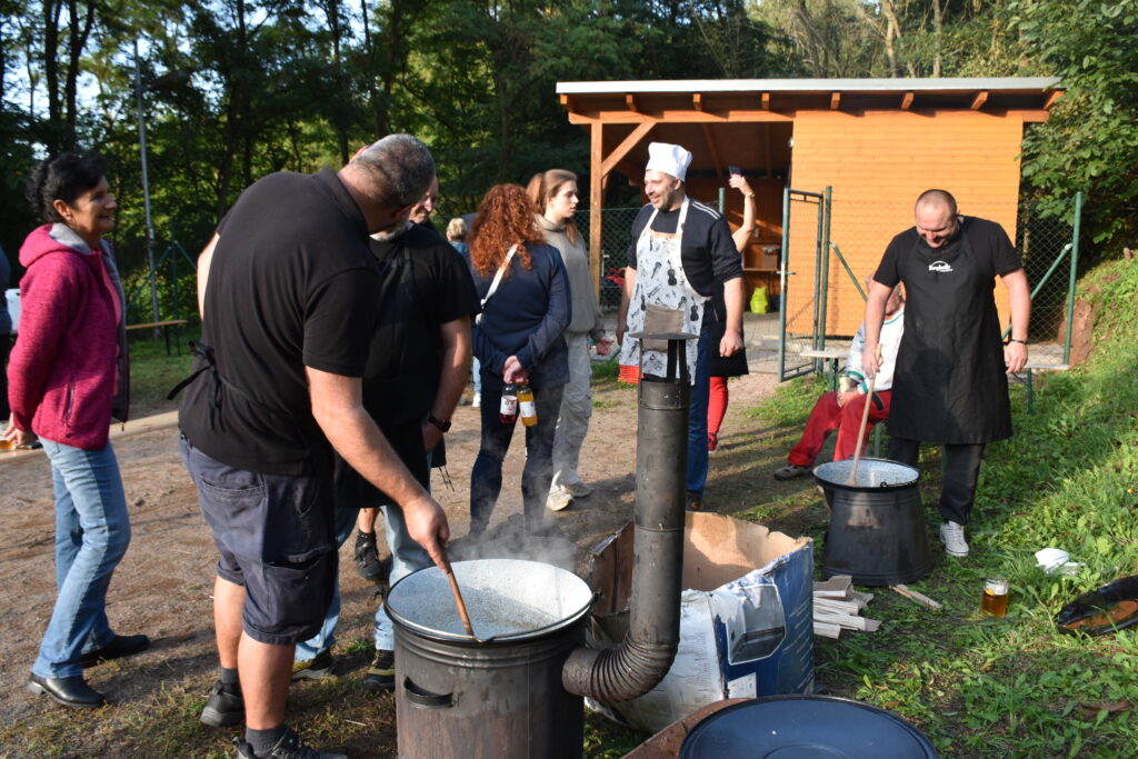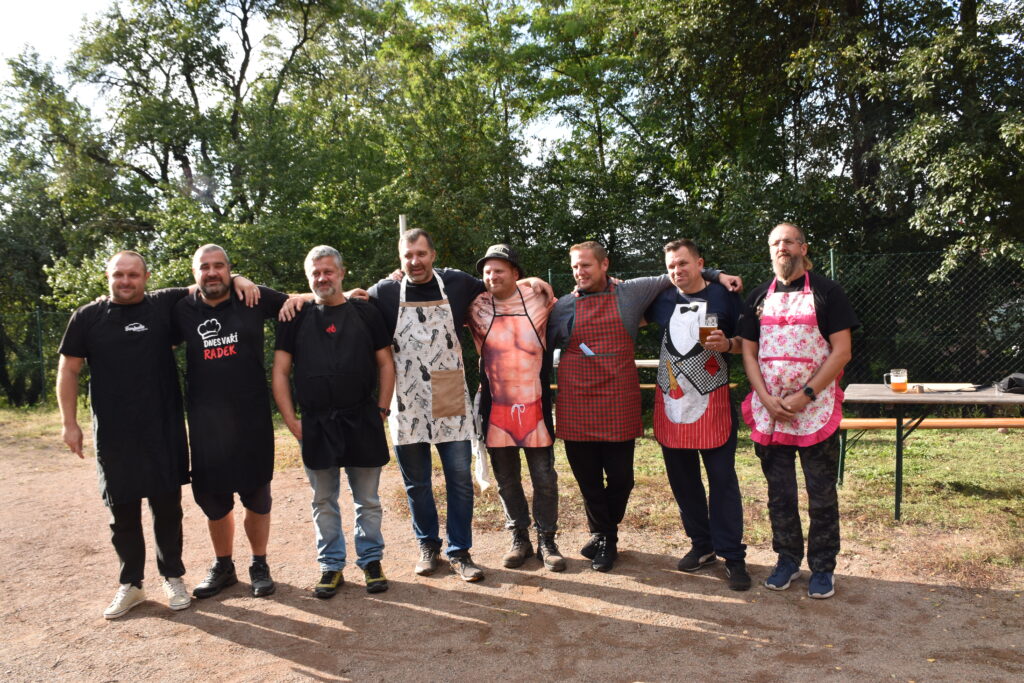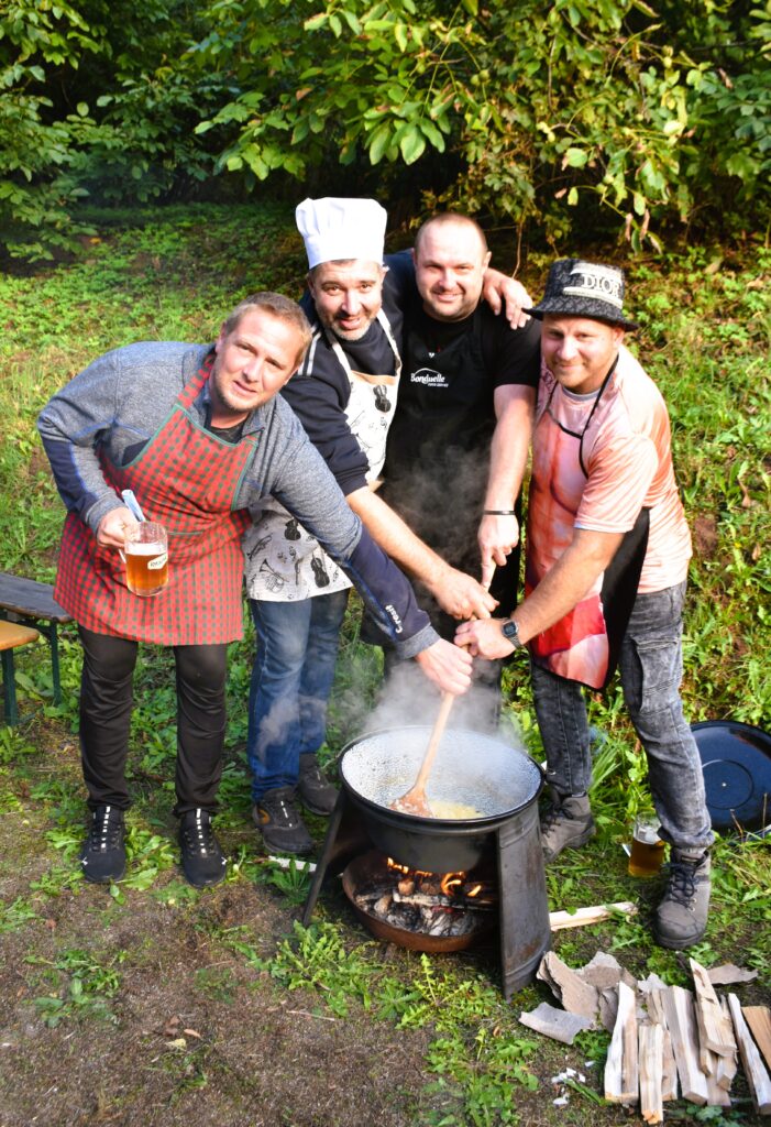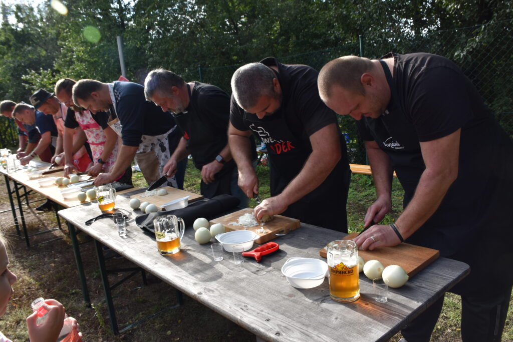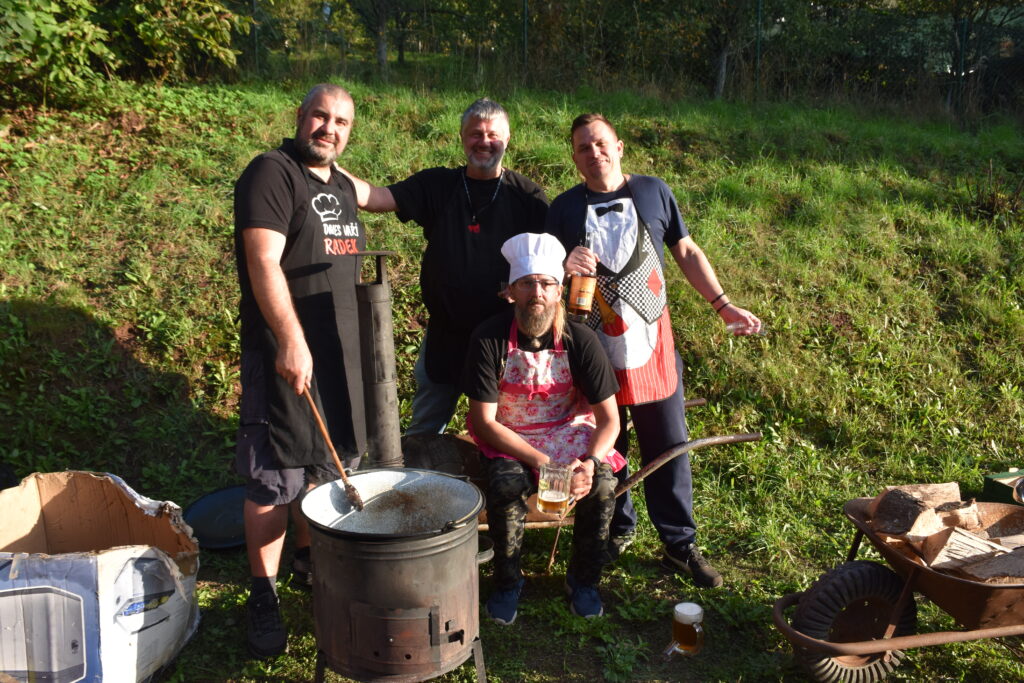 Koncem září 27.9.2025 jsme poprvé uspořádali akci Den otců aneb “Táta v hlavní roli“. Zpočátku jsme byli trochu v rozpacích – koneckonců to byla premiéra, ale tatínkové si rychle oblékli slušivé zástěry a pustili se do soutěžení. Nejprve předváděli své mistrovské schopnosti v krájení cibule (někteří snad tajně cvičili doma), a pak ve družstvech vařili na ohni kotlíkový guláš. Nechyběl ani pivní souboj, spousta smíchu, dobrého jídla a pohodové atmosféry. Nakonec všichni návštěvníci ochutnali oba guláše a vyhlásili vítěze. Ale pravda je, že oba guláše byly naprosto vynikající – naši chlapi si za ně zasloužili opravdu velkou pochvalu!