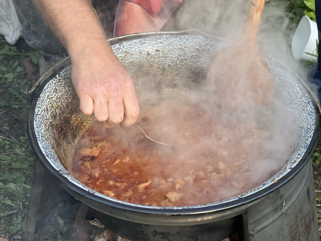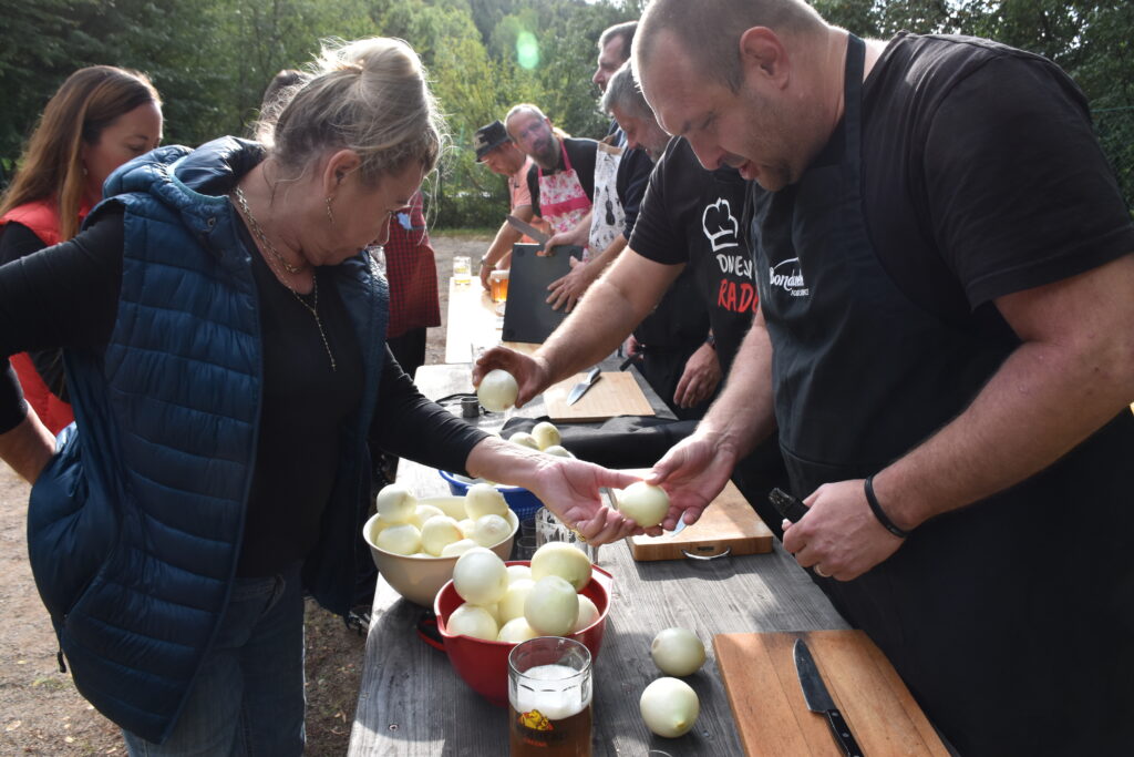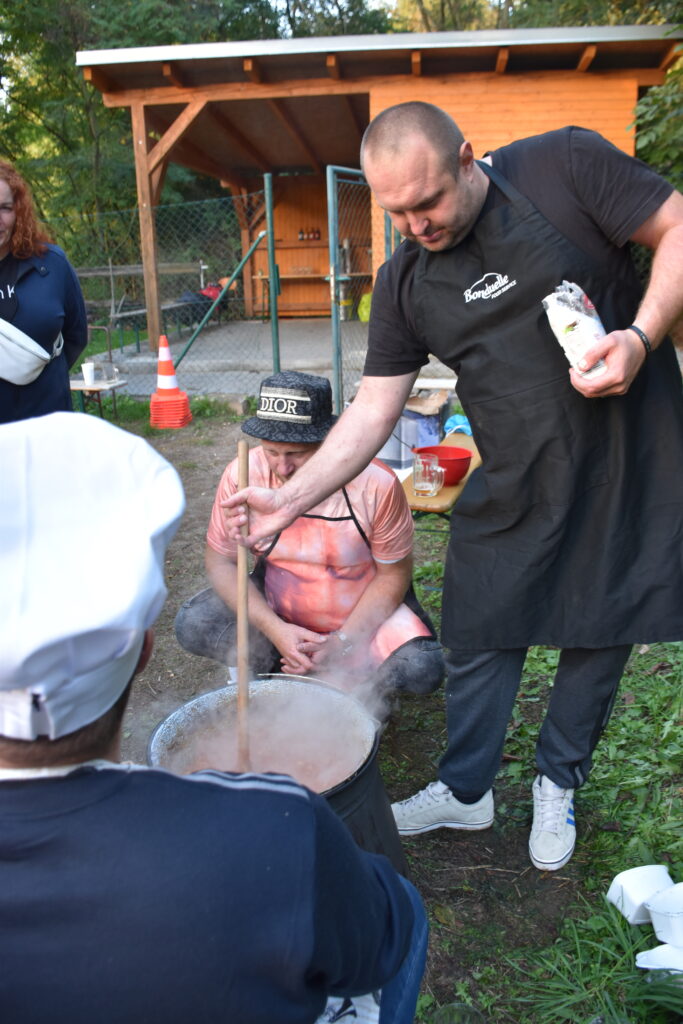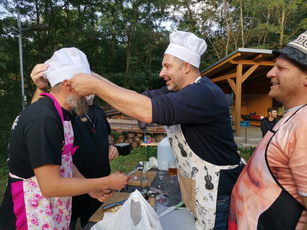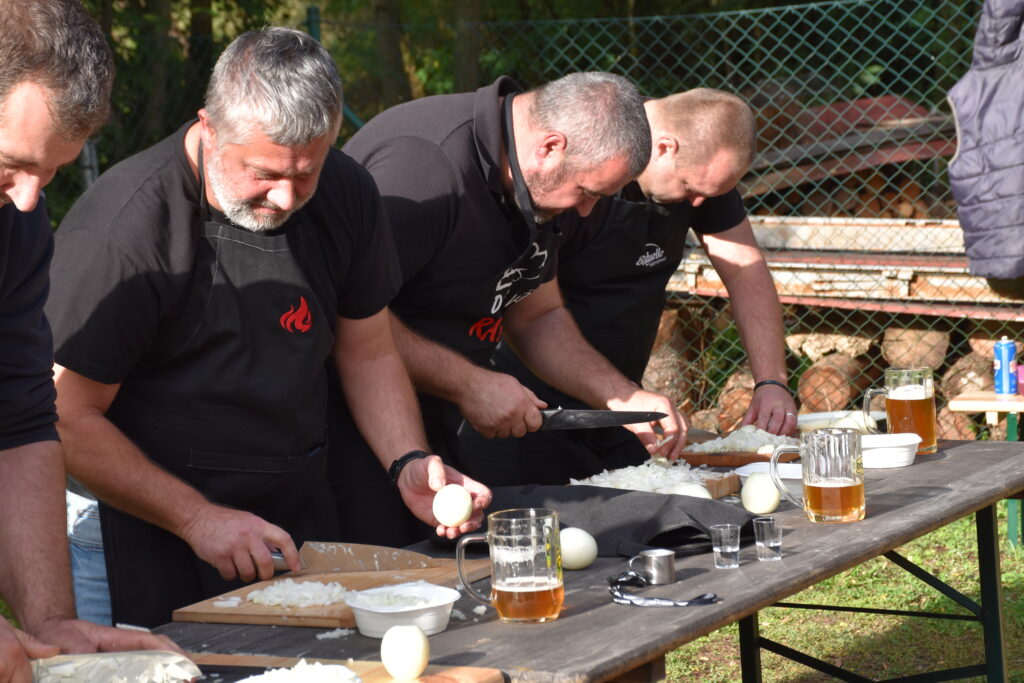 Koncem září 27.9.2025 jsme poprvé uspořádali akci Den otců aneb “Táta v hlavní roli“. Zpočátku jsme byli trochu v rozpacích – koneckonců to byla premiéra, ale tatínkové si rychle oblékli slušivé zástěry a pustili se do soutěžení. Nejprve předváděli své mistrovské schopnosti v krájení cibule (někteří snad tajně cvičili doma), a pak ve družstvech vařili na ohni kotlíkový guláš. Nechyběl ani pivní souboj, spousta smíchu, dobrého jídla a pohodové atmosféry. Nakonec všichni návštěvníci ochutnali oba guláše a vyhlásili vítěze. Ale pravda je, že oba guláše byly naprosto vynikající – naši chlapi si za ně zasloužili opravdu velkou pochvalu!