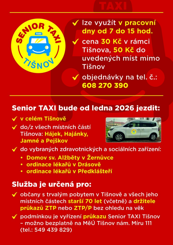 Službu Senior TAXI budou moci od ledna 2026 využít občané s trvalým pobytem v Tišnově a všech jeho místních částech starší 70 let (včetně) a držitelé průkazů ZTP nebo ZTP/P bez ohledu na věk. Podmínkou je vyřízení průkazu Senior TAXI Tišnov.