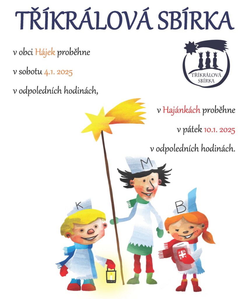 Tříkrálová sbírka v obci Hájek a Hajánky, proběhne v sobotu 4.1.2025 a v pátek 10.1.2025.