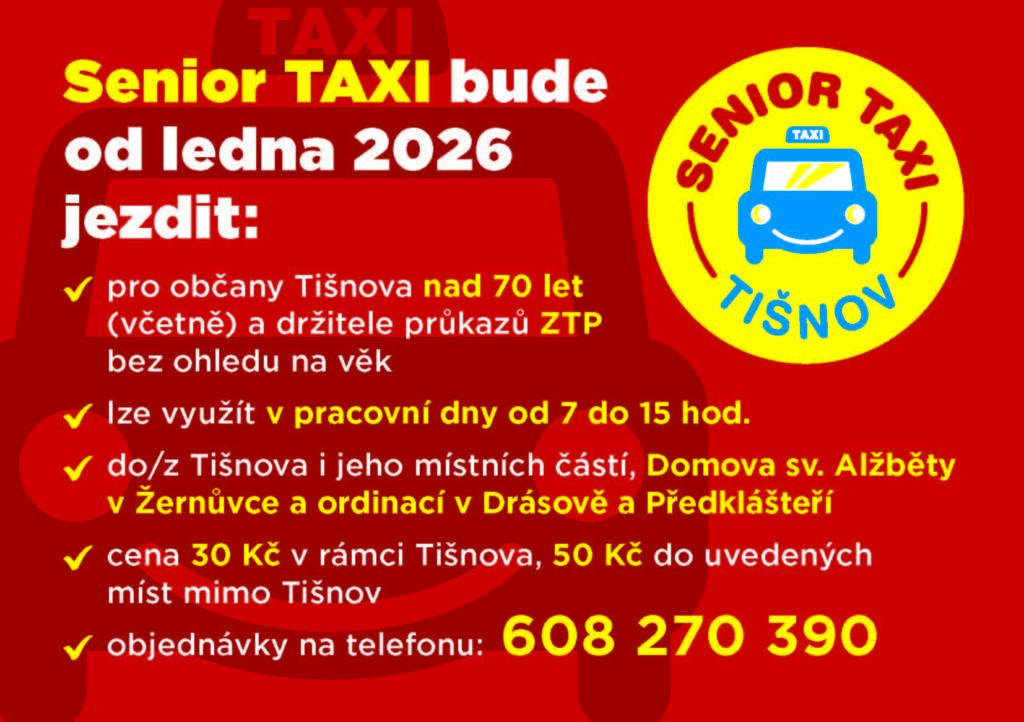 Službu Senior TAXI budou moci od ledna 2026 využít občané s trvalým pobytem v Tišnově a všech jeho místních částech starší 70 let (včetně) a držitelé průkazů ZTP nebo ZTP/P bez ohledu na věk. Podmínkou je vyřízení průkazu Senior TAXI Tišnov. Vydávání průkazek na Senior TAXI … Číst více »
