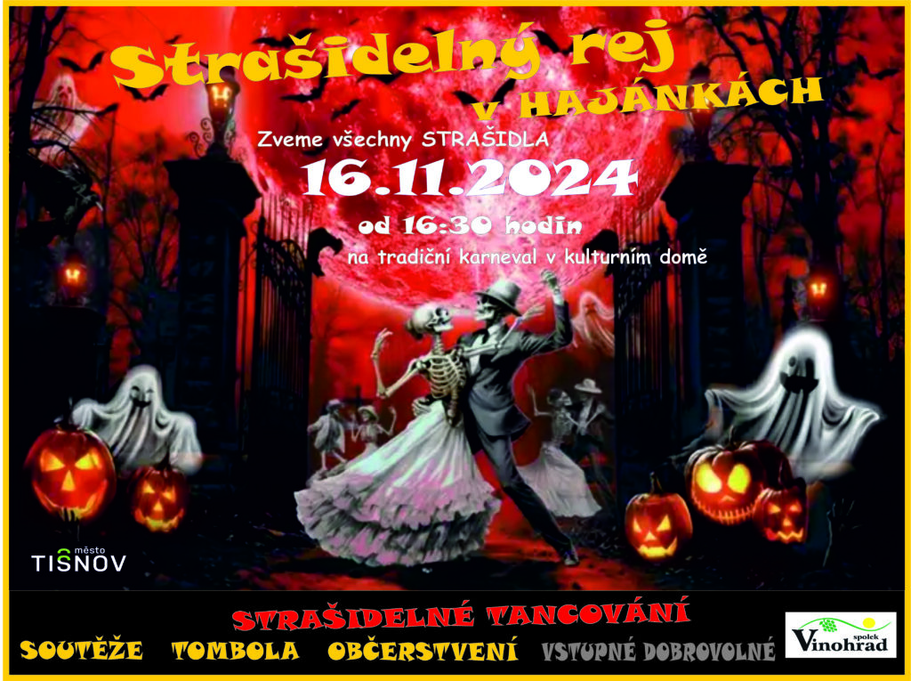 Přijďte si s námi zatančit a zasoutěžit na poslední listopadový karneval v Hajánkách, který se bude konat v sobotu 16.11.2024 od 16:30 hodin v kulturním domě. Pro děti a dospělé ve strašidelných maskách, máme připravené soutěže, bohatou tombolu a samozřejmě občerstvení. Těšíme se na Vás.