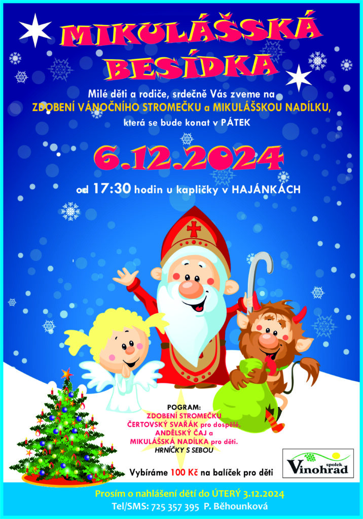 Spolek Vinohrad zve všechny děti a rodiče na zdobení vánočního stromečku u naší kapličky v Hajánkách, kde je poté poctí svojí návštěvou Mikuláš s čerty a andílky.