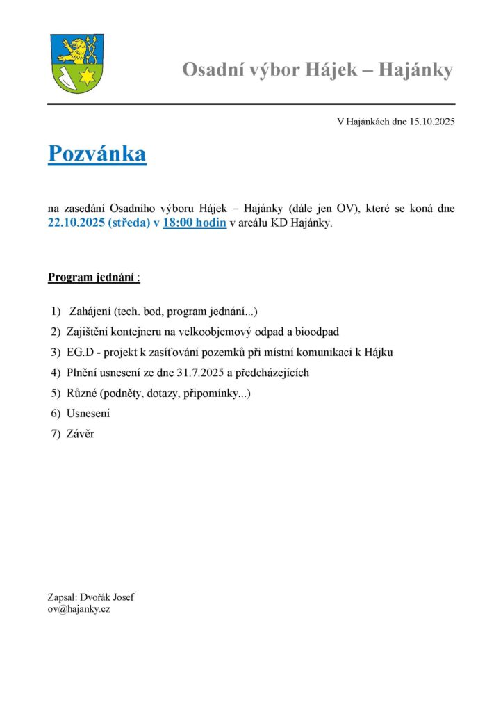 Pozvánka na zasedání OV Hájek – Hajánky dne 22.10.2025