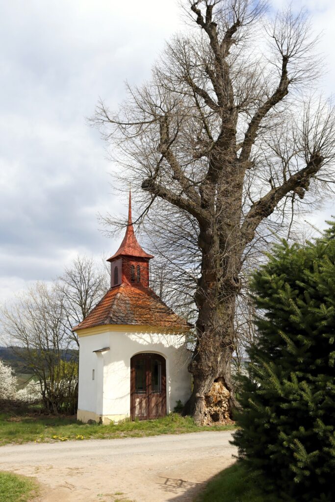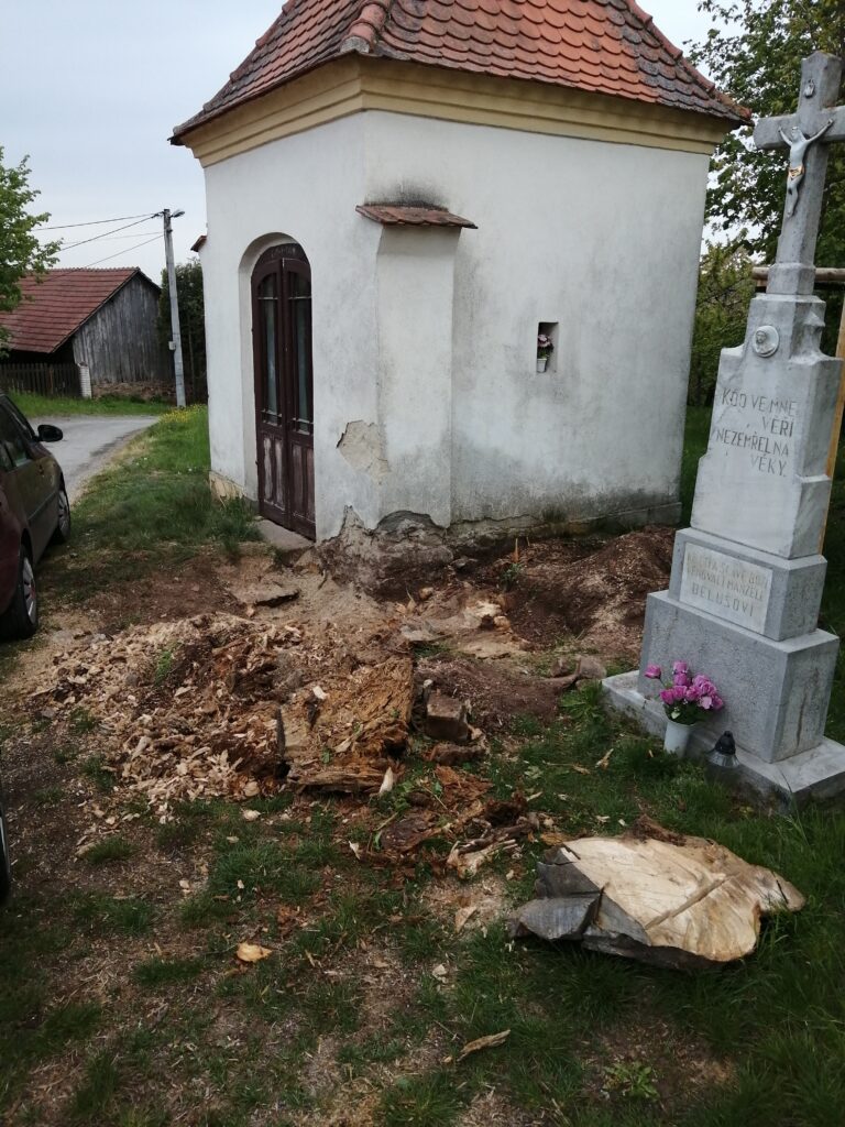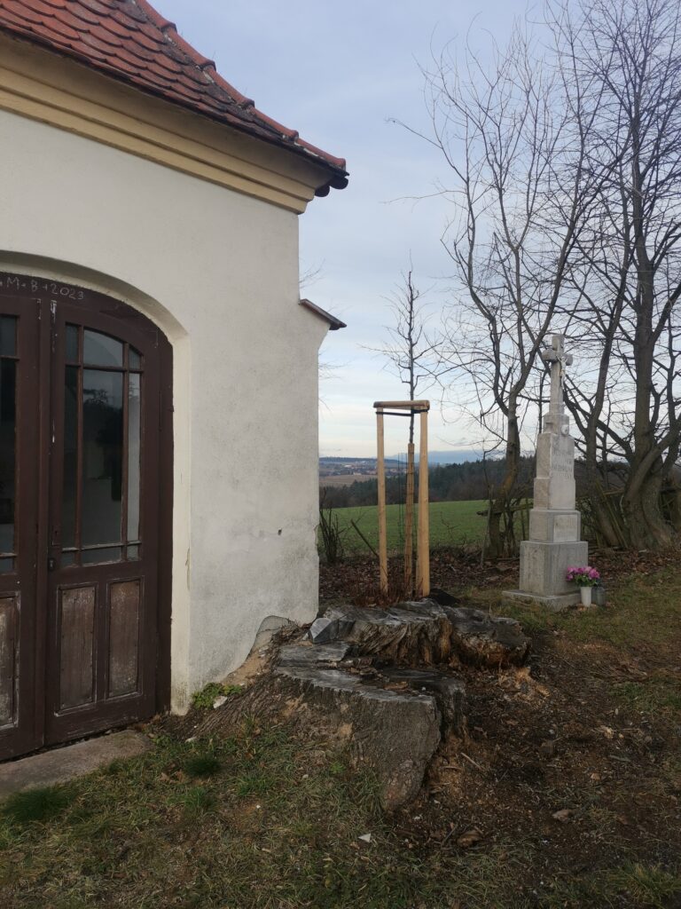 Ve spolupráci s panem Radimem Králem (OSMaKS Tišnov), jsme letos zahájili první kroky k opravě kapličky v Hájku, která je díky vrostlému kmeni staré lípy poškozená. Jelikož v loňském roce muselo proběhnout pokácení tohoto přes 200 let starého stromu, zůstal nám po ní jen obrovský kmen, který bude nutné odstranit, aby mohla proběhnout oprava kapličky.